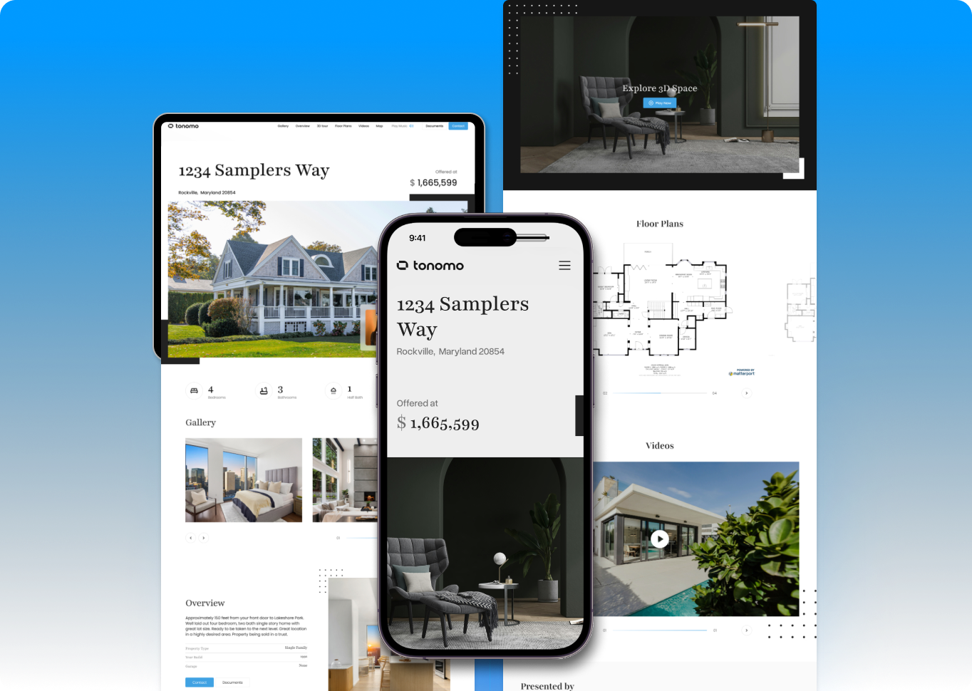 Stand out from competitors who just send a folder of JPEGs. Tonomo automatically generates branded property websites for every order—complete with photo galleries, virtual tours, video, and lead capture. Your clients get marketing-ready pages they can share with buyers immediately.