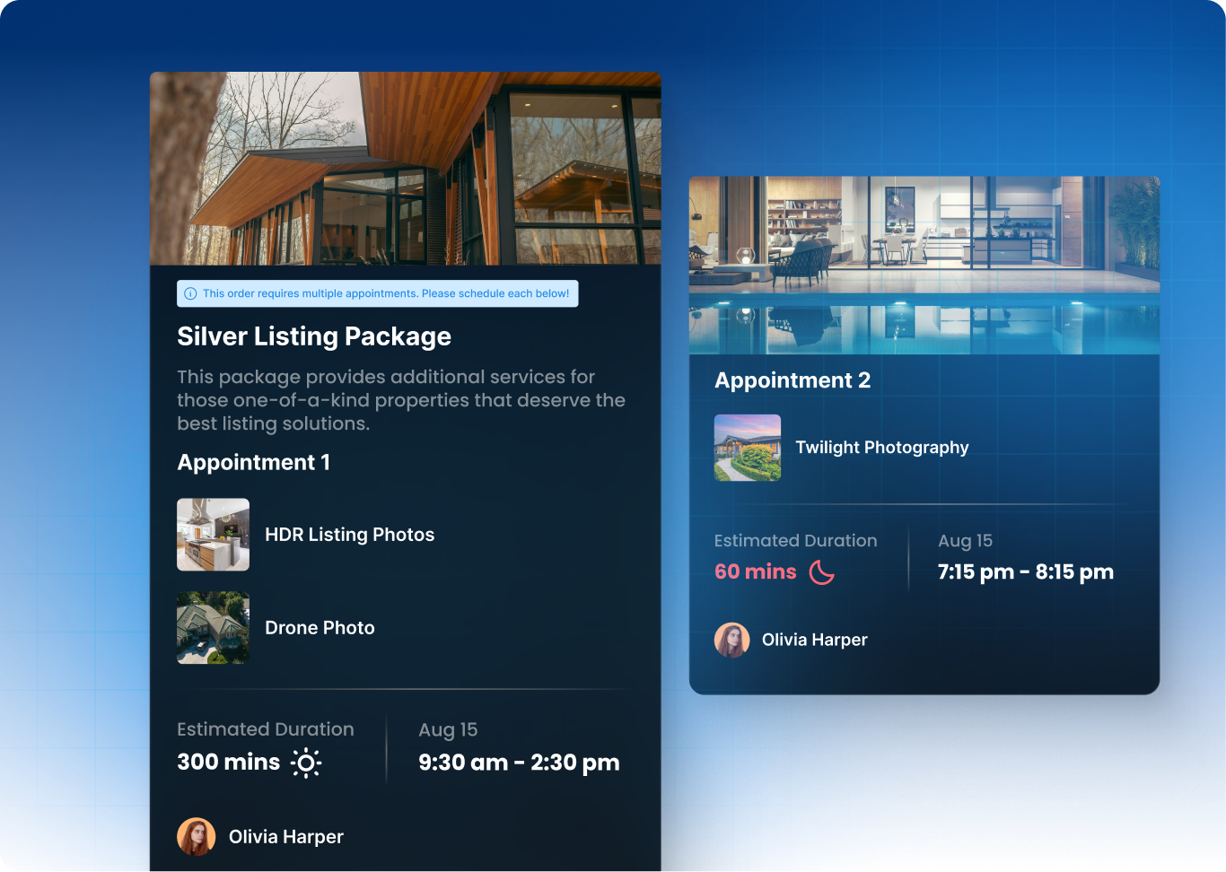 Some jobs need more than one photographer—or a return visit for twilight shots. Tonomo handles complex scheduling automatically: assign a photo specialist for the daytime shoot and a drone operator for aerials, or schedule a twilight return without manual calendar juggling.